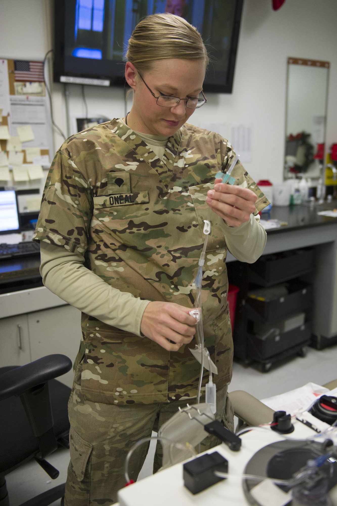 CJTH Blood Bank provides life force in trauma Published Jan. 4, 2016 By Tech. Sgt. Robert Cloys 455th Air Expeditionary Wing Public Affairs BAGRAM AIRFIELD -- Life-saving platelet transfusions are needed every day by injured service members and patients with life-threatening injuries. At the Craig Joint Theater Hospital at Bagram Air Field, Afghanistan, a small team of Army and Air Force members perform the critical task of acquiring those platelets. Platelets aid damaged blood vessels by forming clots at the site of injury preventing further blood loss. “We need platelets on almost a daily basis because we support both of the Role 3 facilities in theater,” said Capt. Jacquelyn Messenger, 153rd Blood Support Detachment commander. “We are currently the only place in Central Command that collects them.” Both Bagram and Kandahar Air Fields in Afghanistan have NATO Role 3 hospitals capable of providing many of the same treatment capabilities as major hospitals in non-austere environments. The shelf life of platelets is limited to only five days, making it impossible to import from continental United States. In order to have this critical blood component available in theater, the BSD uses an apheresis machine to collect platelets. Blood is drawn out, platelets are extracted and remaining blood components are returned to the donor. “The platelet unit that we get from a donation is a concentrated version. That’s one of the reasons we draw them,” said Spc. Lauren O’Neal, 153rd BSD medical laboratory technician. “It takes six units of whole blood to get what you would get from one unit of platelets. When we are collecting platelets, we are actually giving all your red cells back through the same needle. We keep the platelets, but everything else we don’t need we give back. We end up processing almost half of the body’s blood volume to get that amount of platelets in about six cycles.” The donation process takes approximately two hours to complete. Fortunately, the process is different than a normal blood donation, and members are able to immediately return to their jobs. “Red blood cells provide oxygen carrying capacity and we give all that back,” said Messenger. “So it’s not going to affect your ability to perform and do your missions.” Before any lifesaving can be accomplished in the operating room, careful sorting has to take place in the lab. “After we get all of the blood components, it’s our job to make sure its compatible with those receiving it,” said Tech. Sgt. Joye Lamme, 455 Expeditionary Medical Operations Squadron medical laboratory NCO in charge. “There is zero tolerance for errors in blood donations. We can’t give the person the wrong blood type or the wrong component when providers are requesting them, and we have to make sure that the OR gets the blood right away.” Once the lab has completed their tests to ensure compatibility, the blood is available to be transfused. “When someone has a life-threatening injury and is hemorrhaging, I need to replace their blood loss to give time for the surgeons to control the bleeding. Recently, we had a patient with massive blood loss that required over 50 units packed red blood cell, 50 units of plasma and 24 units of platelets. The patient would not have survived his injuries without having blood available,” said Lt. Col. Anita Upp, 455th EMDOS Operating Room flight commander. Since July 2015, the 153rd BSD apheresis team at CJTH has collected 181 platelet donations and pre-screened nearly 400 potential donors; of those donations, 35 have been used in transfusions. Although the blood routinely used at the hospital comes from U.S. military donor centers, the hospital does have the ability to draw whole blood during emergency situations when blood resources are scarce. This is accomplished by utilizing a large donor pool of pre-screened U.S. donors local to the emergency area. “We maintain an active donor pool, which is why we do the pre-screen drive every 90 days,” said Messenger. “We collect information to make sure potential donors are eligible to donate, do testing for infectious diseases to make sure that they are safe to donate, and keep a roster of when they are going to redeploy, their contact information and their blood type so we know exactly who we can contact for each blood type needed.” Because all platelet donations are universal, unlike whole blood, donated platelets are kept on hand to be utilized by any patient in need. With the aid of the Army apheresis team and the dedication of routine blood donors, the CJTH blood bank is a life force in the event of a trauma.