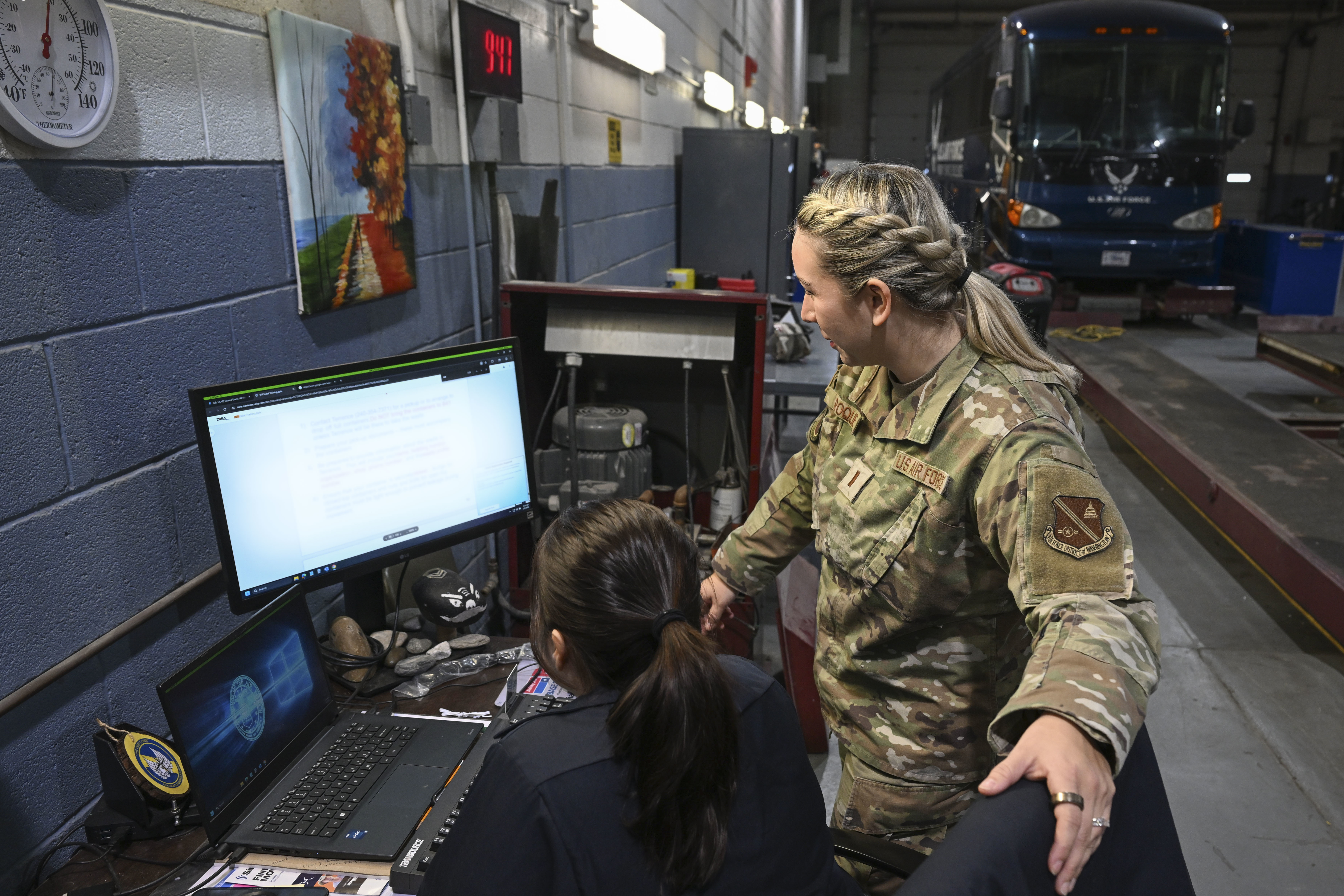 U.S. Air Force 2nd Lt. Alexandra R. Roque, right, vehicle maintenance flight commander of the 11th Logistics Readiness Squadron, mentors an Airman at Joint Base Anacostia-Bolling, Washington, D.C., Jan. 9, 2026. Roque spent 10 years enlisted in the medical field doing various jobs such as aerospace medical and flight medicine before being selected for Officer Training School in August 2024. (U.S. Air Force photo by Senior Airman Geneva Nguyen) (This photo was altered for security purposes by blurring out identification information on the computer screen.)