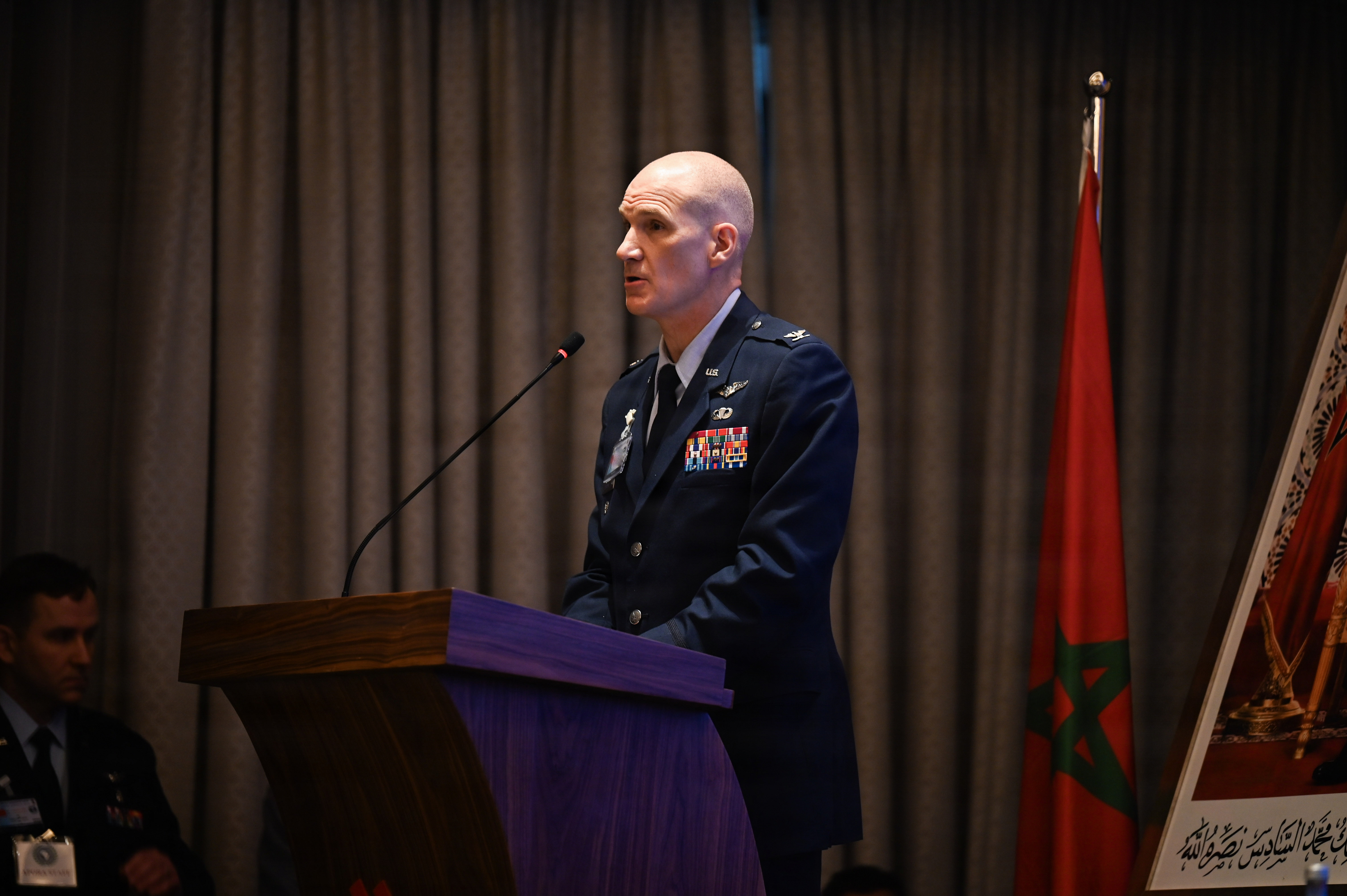 U.S. Air Force Col. Thomas Stamp, U.S. Air Forces in Europe - Air Forces Africa command surgeon, gives his opening remarks at the African Partner Outbreak Response Alliance 2025 Workshop in Rabat, Morocco, December 8, 2025. Representatives from 34 African nations came together with members from the U.S. Africa Command and USAFE-AFAFRICA command surgeon offices to engage in discussion on how to further enhance health security across the African continent. (U.S. Air Force photo by Capt. Benjamin Aronson) (This photo was altered for security purposes by blurring a security badge.)