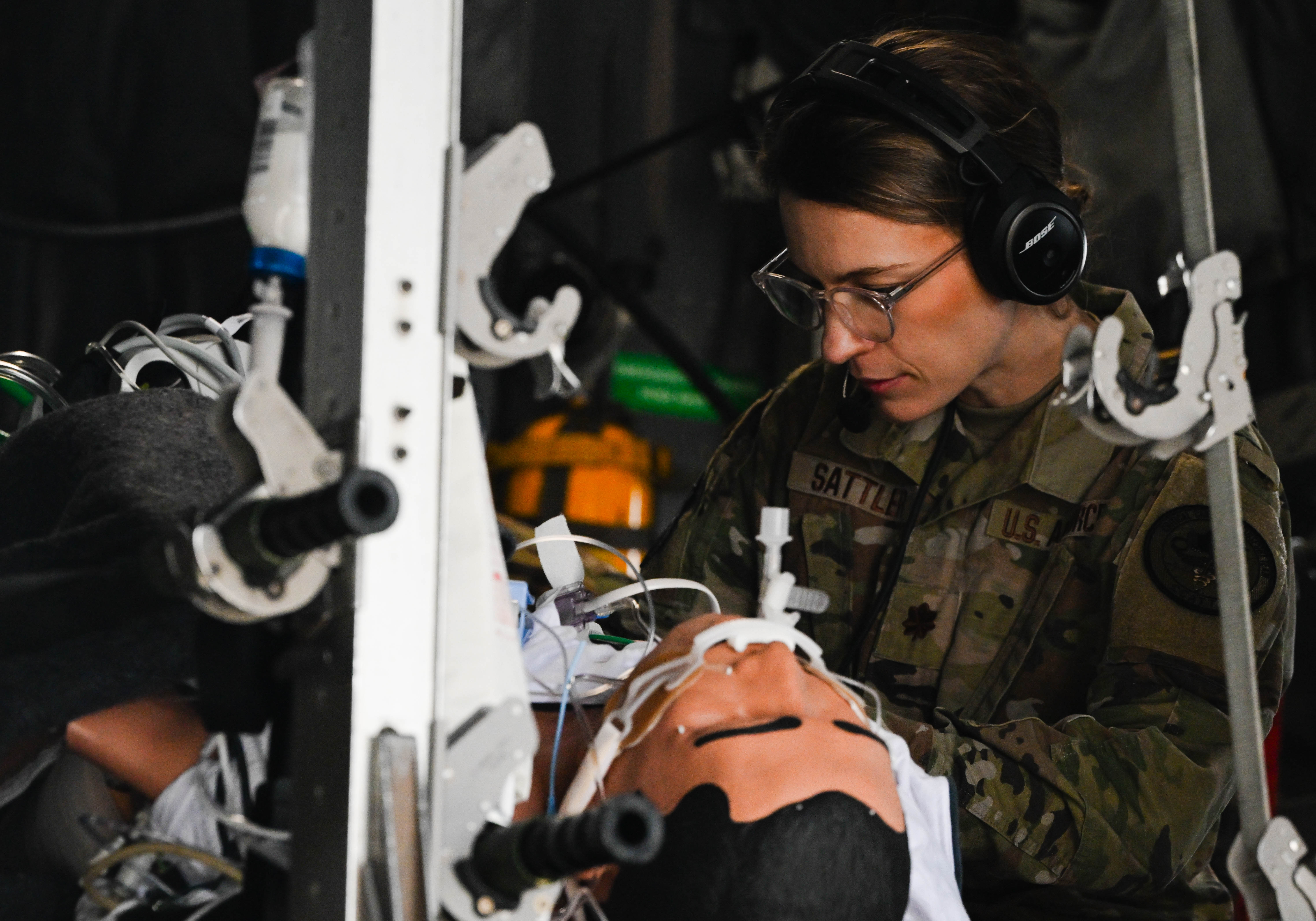 U.S. Air Force Maj. Laura Sattler, 375th Operational Medical Readiness Squadron CCATT doctor, provides care to a simulated patient during a Theater Aeromedical Evacuation System exercise on Scott Air Force Base, Illinois, Nov. 19, 2025. This type of training benefits Airmen across several Unit Type Codes who support U.S. Transportation Command and Air Mobility Command’s global patient movement enterprise. (U.S. Air Force photo by Airman 1st Class Izcalli Martinez)