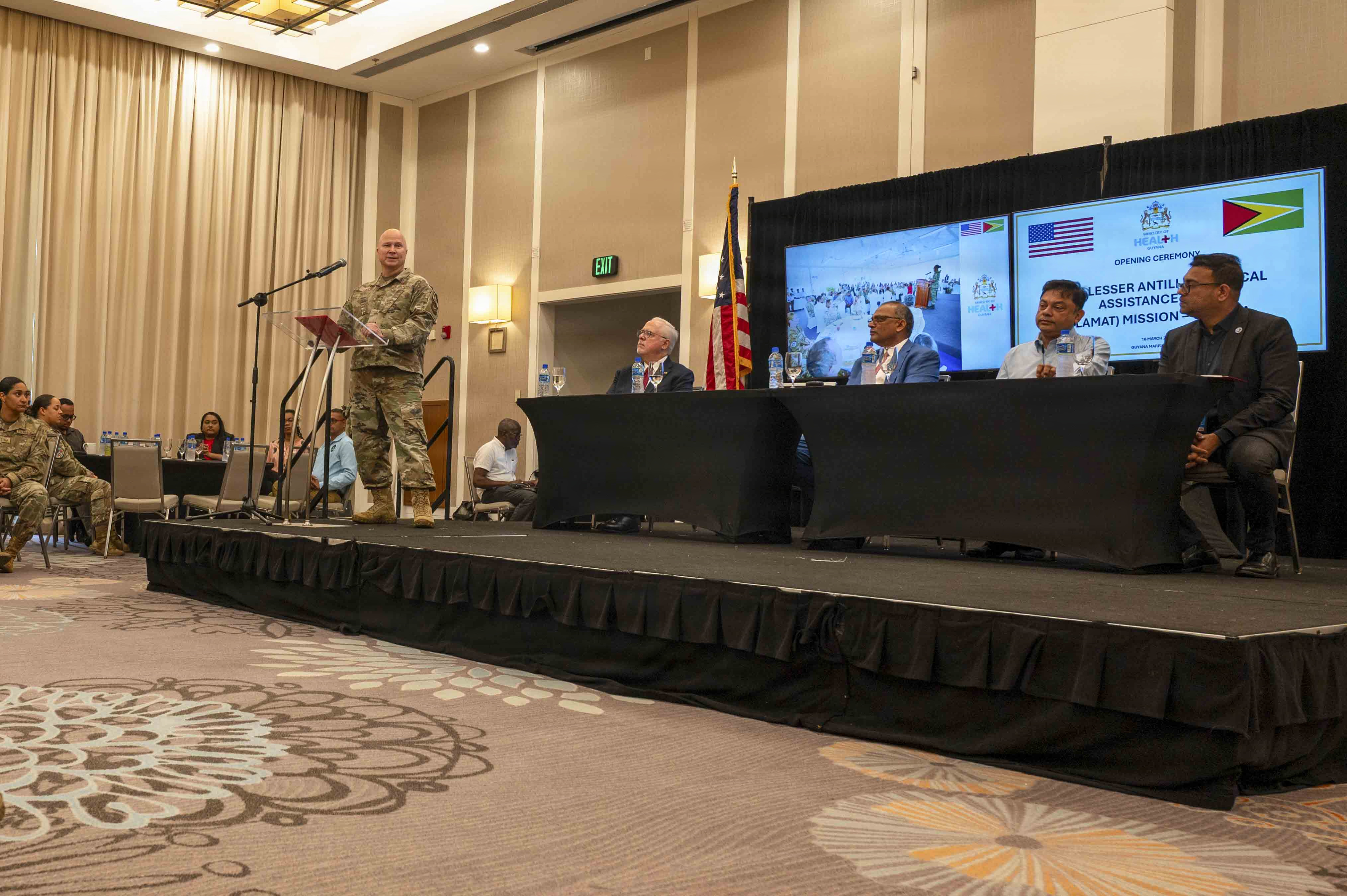 U.S. Air Force Col. Ted Liszeski, Mission Commander for the Lesser Antilles Medical Assistance Team (LAMAT) mission in Guyana, delivers remarks during the opening ceremony for LAMAT26 in Georgetown, Guyana, March 16, 2026. The two-week mission brings together U.S. Air Force medical professionals and Guyanese healthcare providers to deliver specialized care while strengthening regional health resilience across the Cooperative Republic of Guyana. (U.S. Air Force photo by Maj. Stephani Schafer)