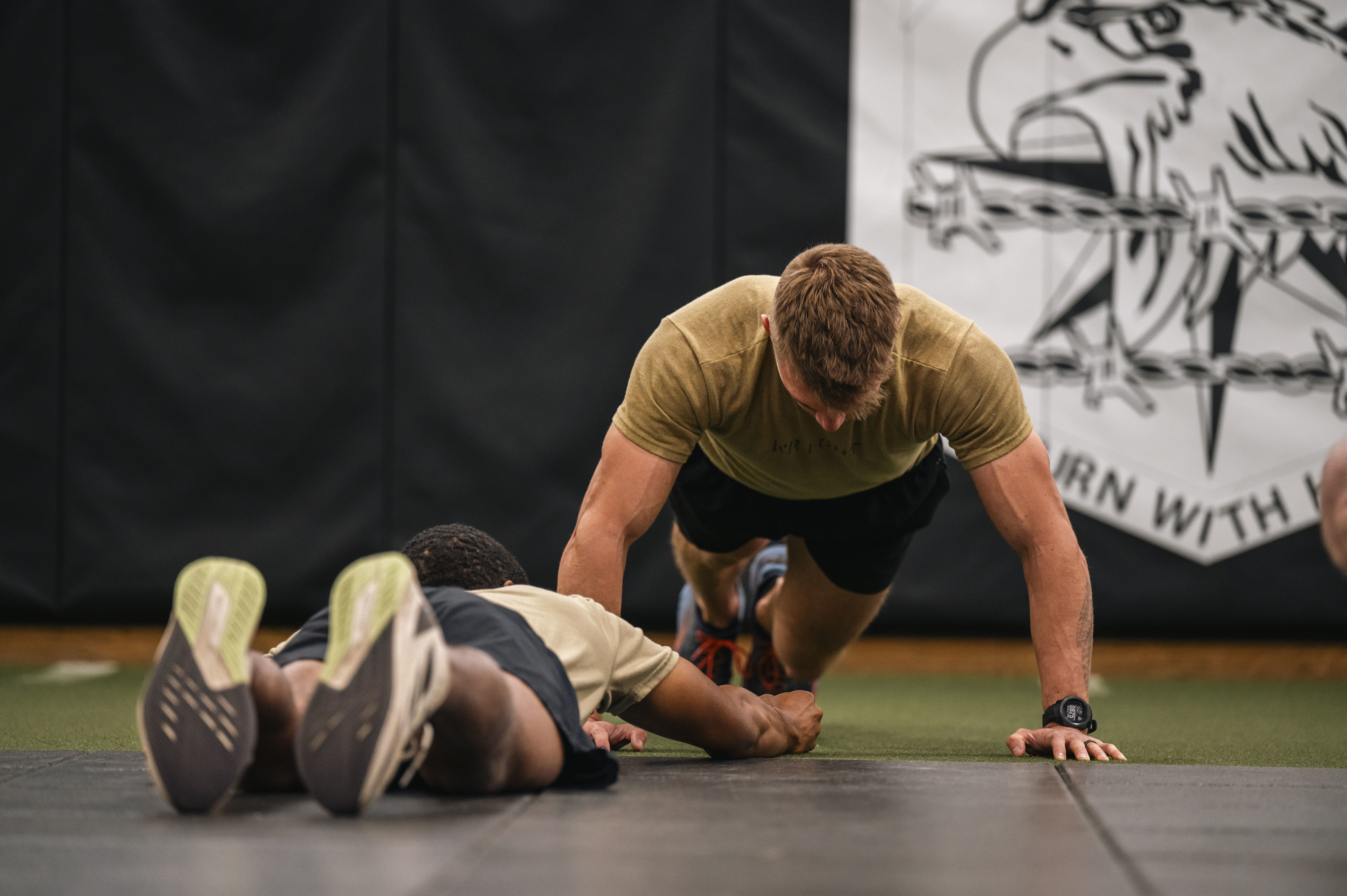 A U.S. Airman with the 66th Training Squadron’s Survival, Evasion, Resistance, Escape pre-team 25-02, performs push-ups during a physical training test at Fairchild Air Force Base, Wash., Oct. 29, 2024. The SERE career field is one of few that require a unique PT test alongside the standard Air Force PT test. The SERE test includes pull-ups, push-ups, sit-ups, a two mile run and a four mile ruck. (U.S. Air Force photo by Senior Airman Tiffany Del Oso)