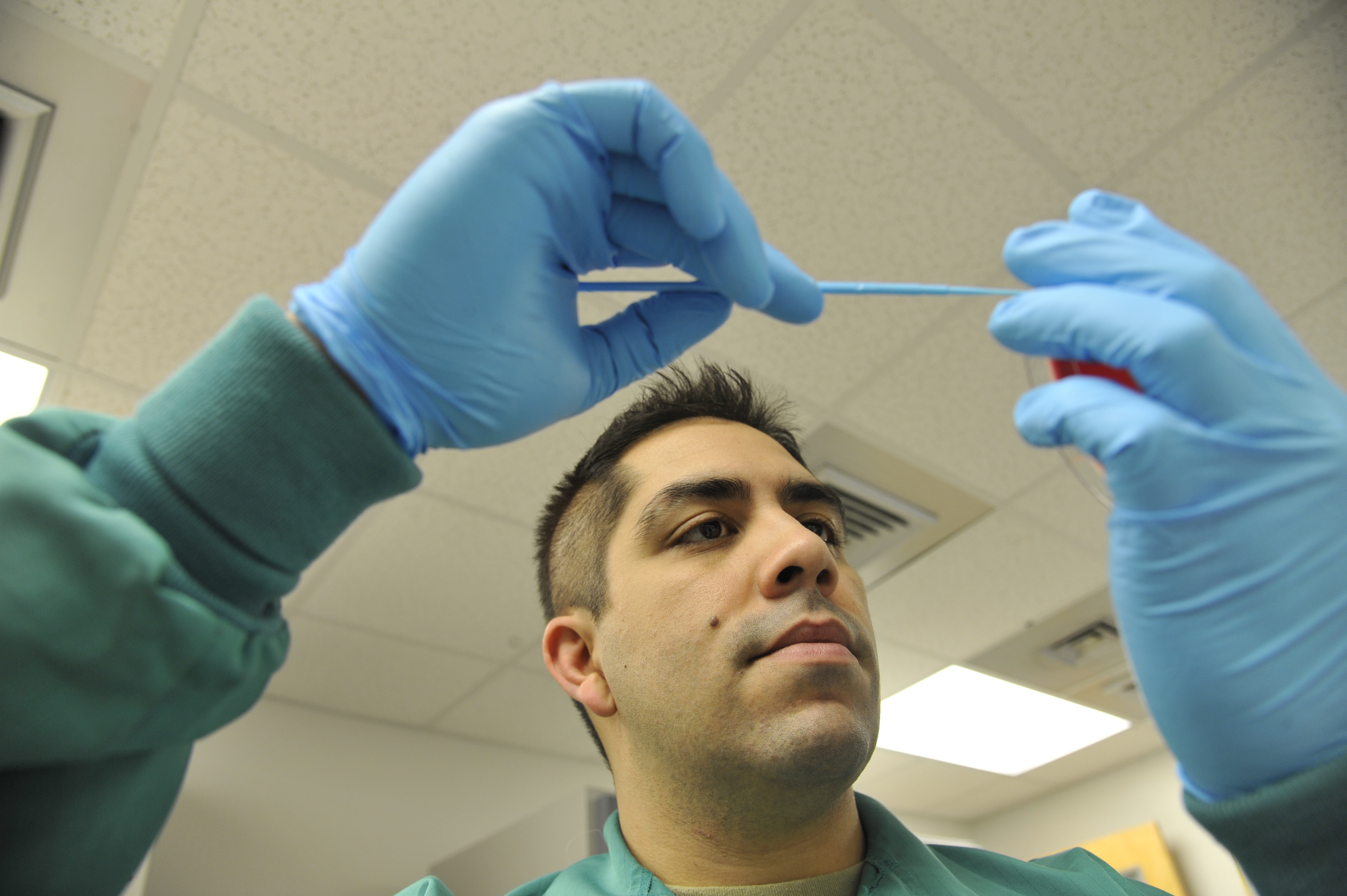 WHITEMAN AIR FORCE BASE, Mo. -- Staff Sergeant Raul Loyo, 509th Medical Group Laboratory Technician, streaks a urine plate, Feb. 20. Plate is used to determine if the urine has a urinary tract infection; which is determined if bacteria grows within the urine or not. (U.S. Air Force photo by Airman 1st Class Keenan Berry) (Released)