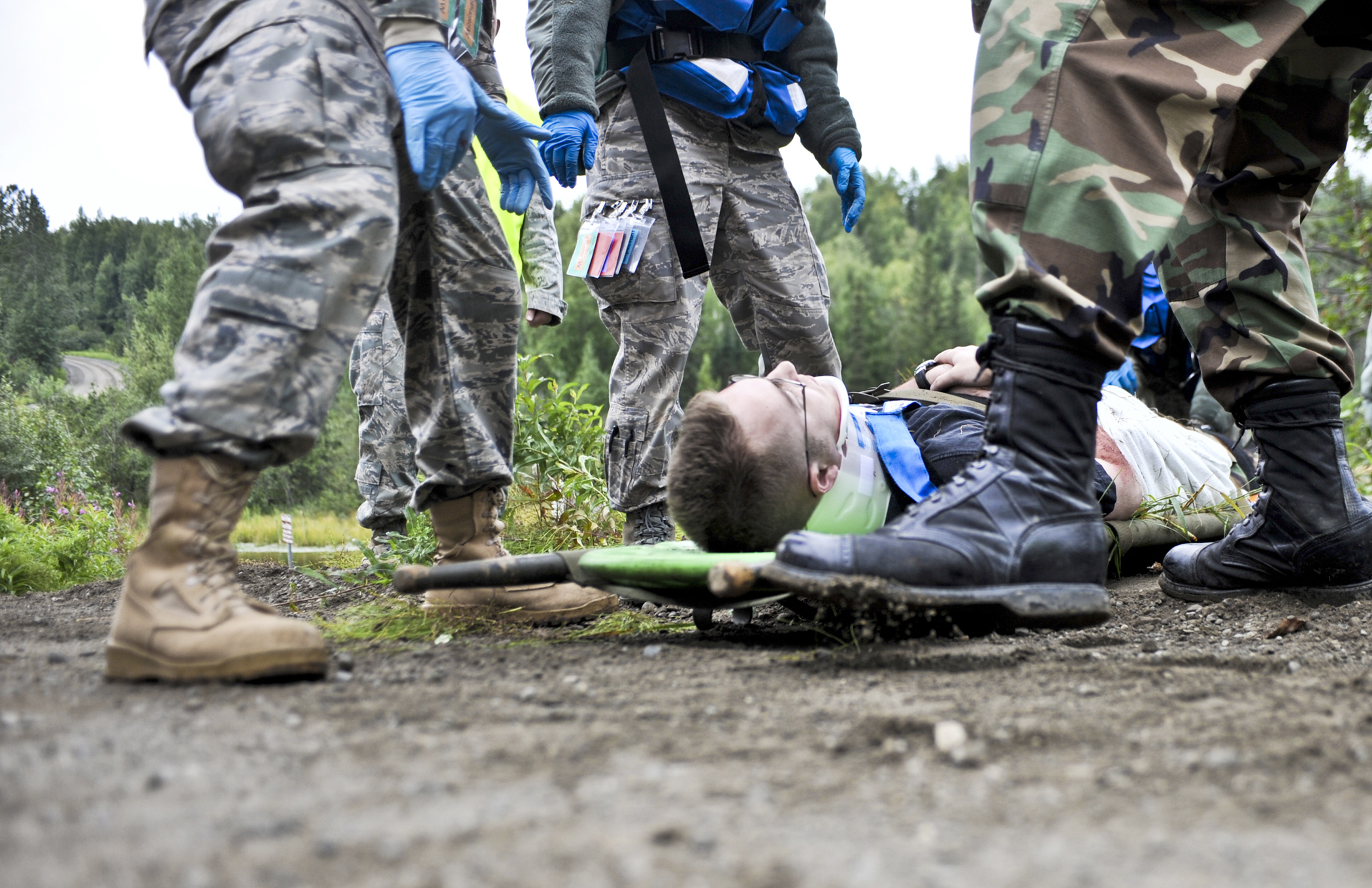 Airmen prepare to transport a "patient" on a litter during a simulated bridge collapse scenario Aug. 12, 2010, at Joint Base Elmendorf-Richardson, Alaska. A five-day Expeditionary Medical Support Training exercise was held for the first time at JB Elmendorf-Richardson from Aug. 9 through 13. (U.S. Air Force photo/Airman 1st Class Christopher Gross)