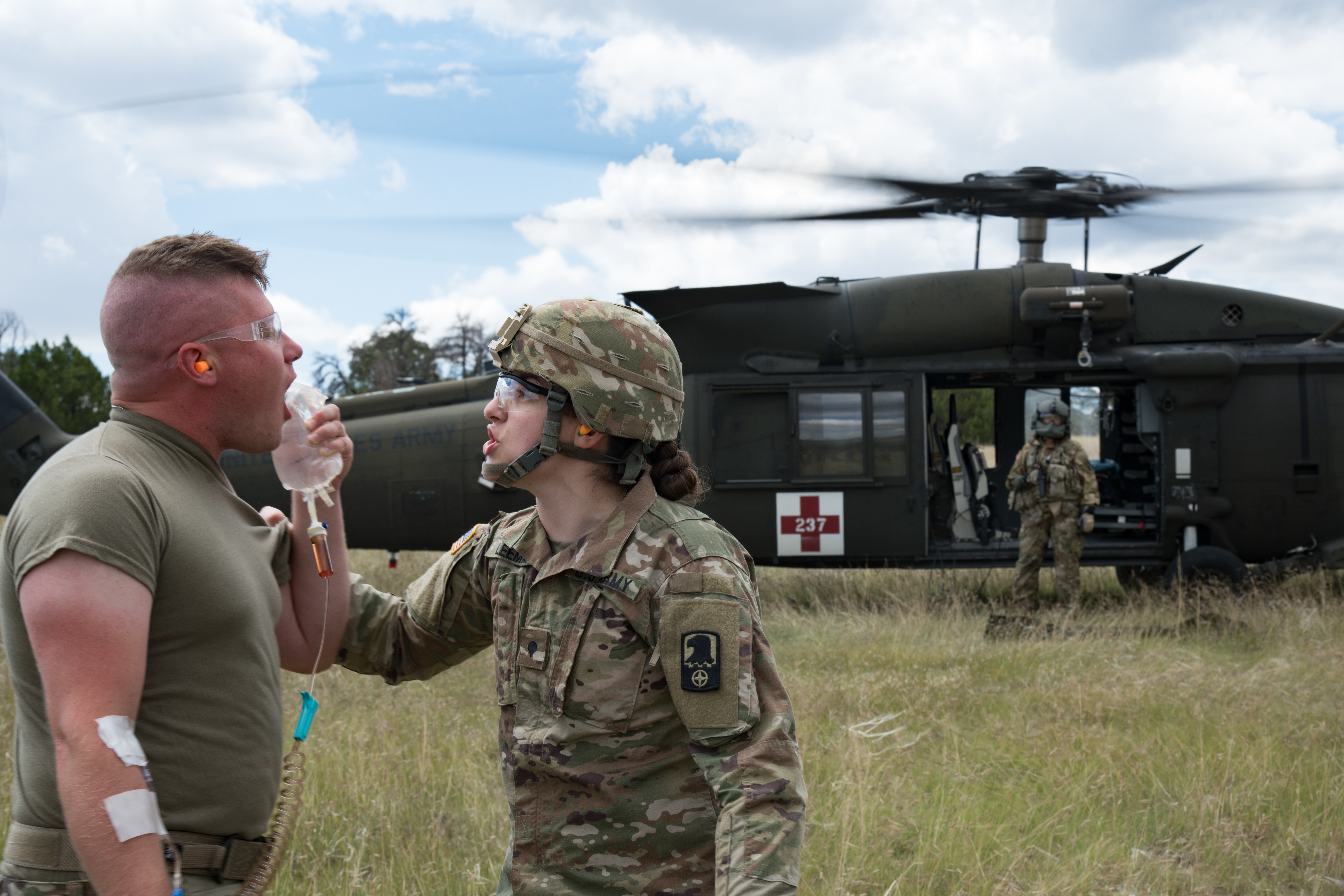 U.S. Army Spc. Tanya Leeman, 5-159 General Support Aviation Battalion combat medic specialist, issues commands to Sgt. Benjamin Suttey, 5-159 General Support Aviation Battalion combat medic specialist, during a training scenario as part of exercise Mountain Medic at Fort Carson, Colorado, Aug. 22, 2022. Suttey roleplayed as a patient suffering from a traumatic brain injury who needed treatment before being evacuated on a UH-60 Blackhawk helicopter. (U.S. Air Force photo by Tech. Sgt. Justin Norton)
